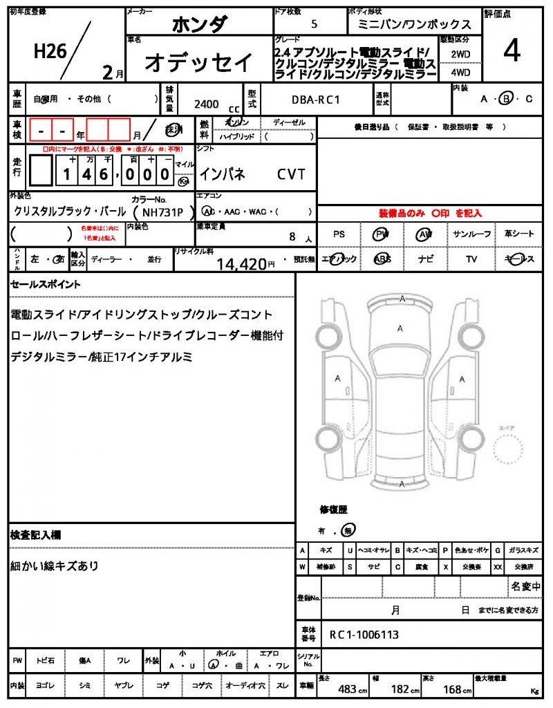 The 2014 HONDA ODYSSEY, a sleek black minivan, is a reliable ride with a powerful 2400 cc engine that runs smoothly on gasoline. With features like power windows and aluminum wheels, you’ll enjoy a comfortable commute. As a used car from Japan, this ODYSSEY is available for international buyers through AutoXGlobal. This HONDA ODYSSEY export from Japan is a great option for those looking for a reliable minivan with a driver’s airbag for added peace of mind.