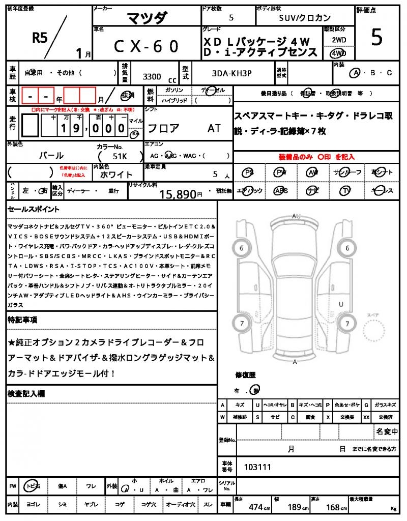Meet the 2023 Mazda CX-60 Pearl SUV, a stylish and capable ride with a strong diesel engine under the hood, pumping out 3300 cc of power. With 4WD capability and power steering for added control, you’ll be tackling any terrain with confidence. This used car is available for international buyers through AutoXGlobal, a trusted platform for Japanese used car exports. For those looking for a reliable and feature-packed SUV, the 2023 Mazda CX-60 Japanese used car export is an excellent choice, complete with power windows and aluminum wheels.