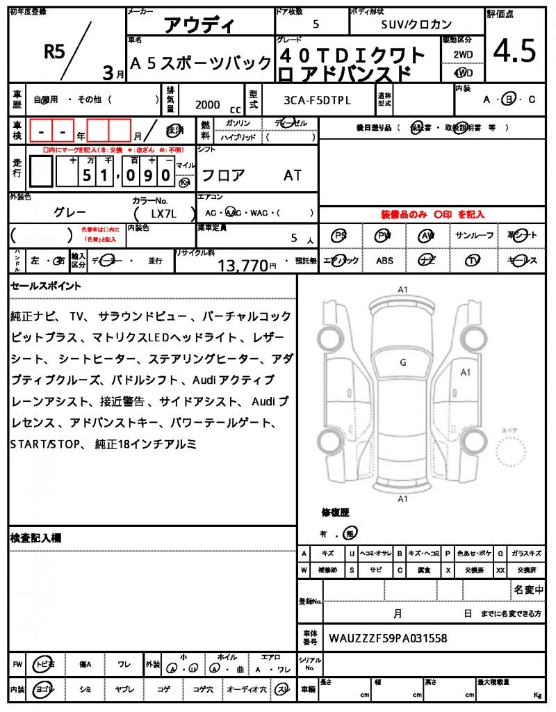 The 2023 AUDI A5 Sportback is a sleek gray SUV that exudes style and sophistication. Powered by a 2000cc diesel engine and featuring 4WD, this vehicle is perfect for off-road adventures. As a used car from Japan, this AUDI A5 Sportback is available for international buyers through AutoXGlobal. Whether you’re looking for a reliable ride or a unique import, this Japanese used car export from AUDI is a great option.