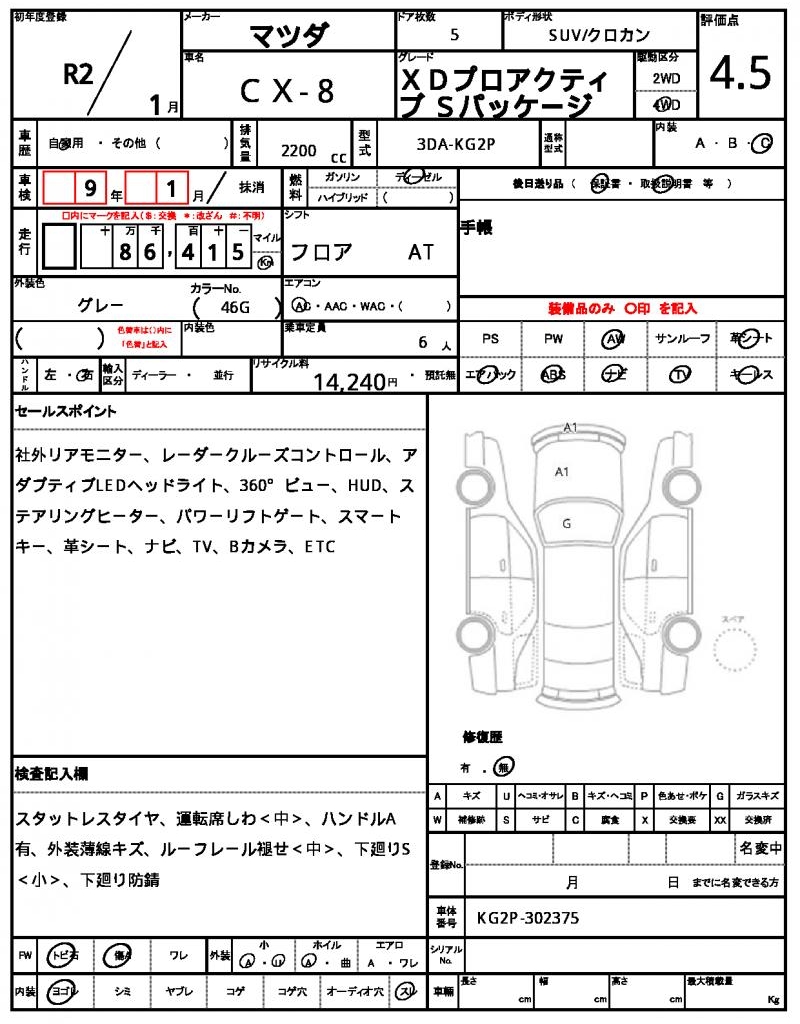 This 2020 MAZDA CX-8 SUV is a stunning gray ride with a powerful 2200 cc diesel engine, paired with a reliable 4WD drive system and aluminum wheels. The car is equipped with a driver’s airbag and car navigation system for a safe and convenient driving experience. If you’re an international buyer looking for a quality used vehicle, look no further than AutoXGlobal, where you can purchase this Japanese used car export. The MAZDA CX-8 is a popular choice for those seeking a reliable and feature-packed SUV, and this Japanese used car export is a great opportunity to own one.