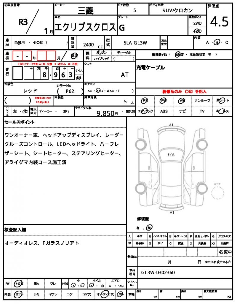 Meet the 2021 Mitsubishi Eclipse Cross, a stunning red SUV that turns heads on the road. Under the hood, you’ll find a 2400 cc gasoline engine paired with a 4WD system, making it perfect for off-road adventures, and featuring power steering for a smooth ride. As a used car from Japan, this Eclipse Cross is now available for international buyers through AutoXGlobal. With its aluminum wheels and power windows, this Japanese used car export is ready to take you on a thrilling ride.