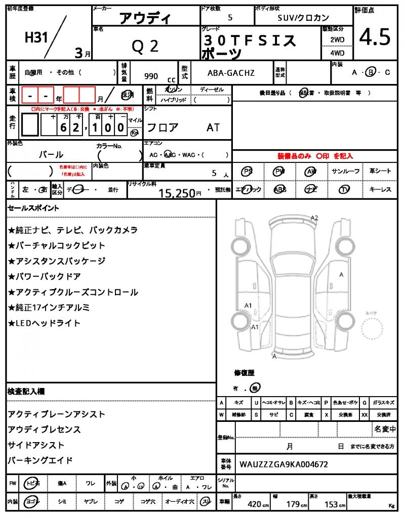This stunning 2019 Audi Q2 SUV is a head-turner in its Pearl finish. Powered by a 990cc gasoline engine, this 2WD vehicle comes equipped with the convenience of power steering and power windows. As a used car from Japan, this gem is now available for international buyers through AutoXGlobal. Explore the world of international used car exports with AutoXGlobal, featuring a range of top-notch vehicles like this 2019 Audi Q2 export from Japan.