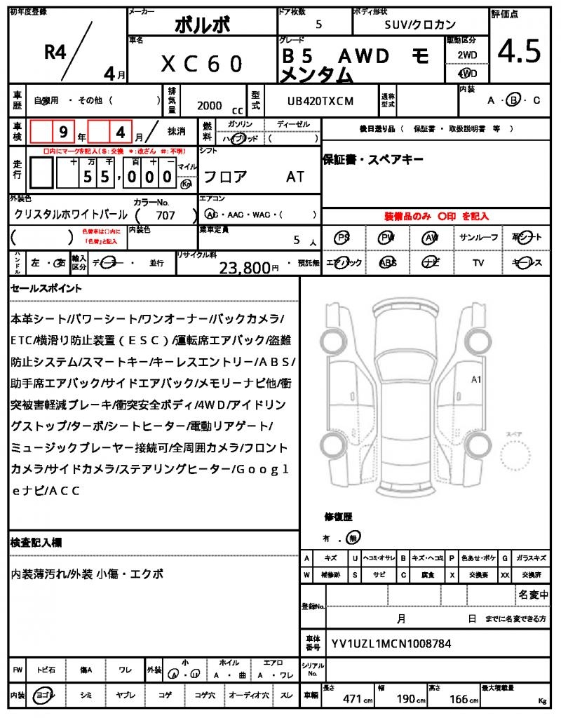 This stunning 2022 Volvo XC60 SUV is presented in a beautiful Pearl finish, offering a perfect blend of style and practicality. Under the hood, you’ll find a 2000cc hybrid engine, paired with 4WD for smooth and confident handling, and enjoy features like power steering and power windows. As a used car from Japan, this Volvo XC60 is available for international buyers through AutoXGlobal, offering a reliable and efficient way to bring this quality vehicle home. With its durable design and versatile capabilities, this Japanese used car export is the perfect choice for those seeking a reliable and comfortable SUV.