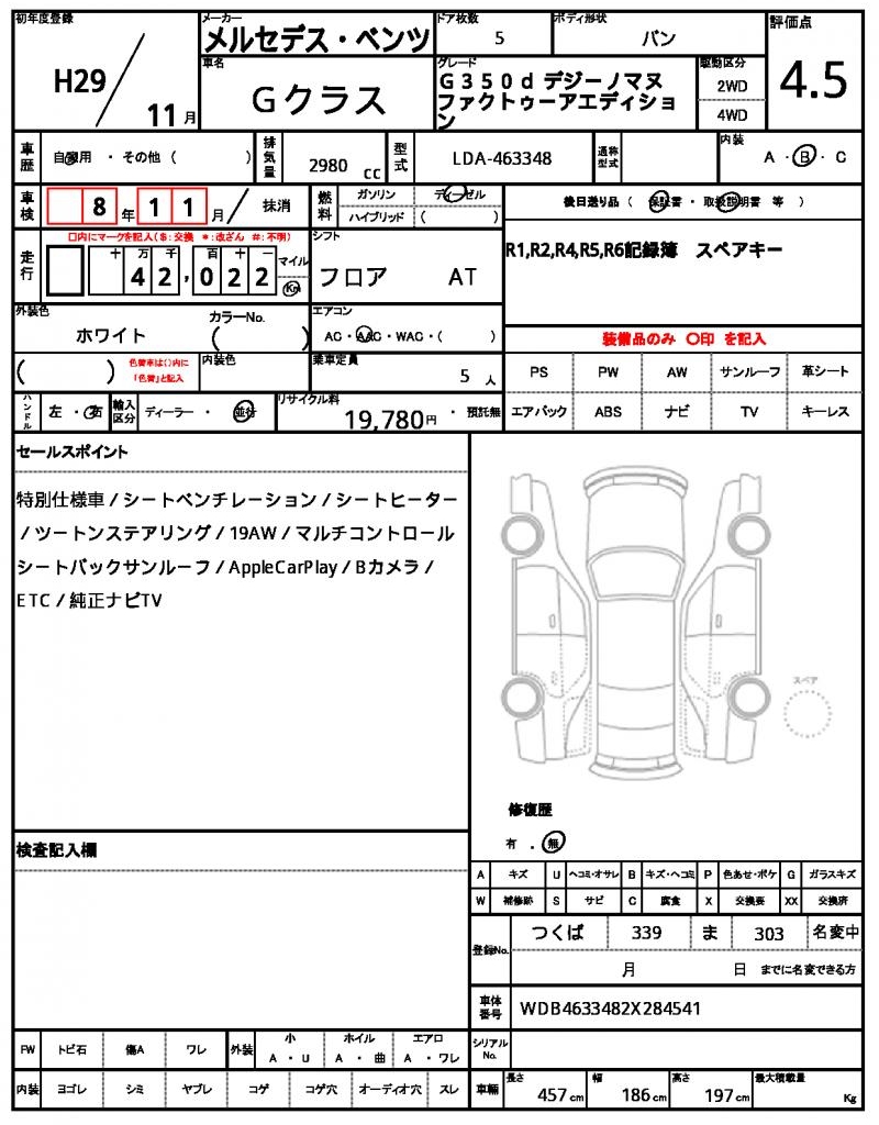 This sleek 2017 Mercedes-Benz G-Class Minivan in black is a sight to behold, with its robust engine and smooth handling making it a joy to drive. Powered by a 2980cc diesel engine, this vehicle is equipped with air conditioning for comfortable travel and a maintenance log and record book to ensure you’re always up to date on its history. Available through AutoXGlobal for international buyers, this used car is ready to be exported from Japan to your doorstep. Whether you’re looking for a reliable people-mover or just want a piece of the Mercedes-Benz G-Class experience, this Japanese used car export is the perfect choice. The Mercedes Benz G-Class is available for export from Japan through AutoXGlobal.
