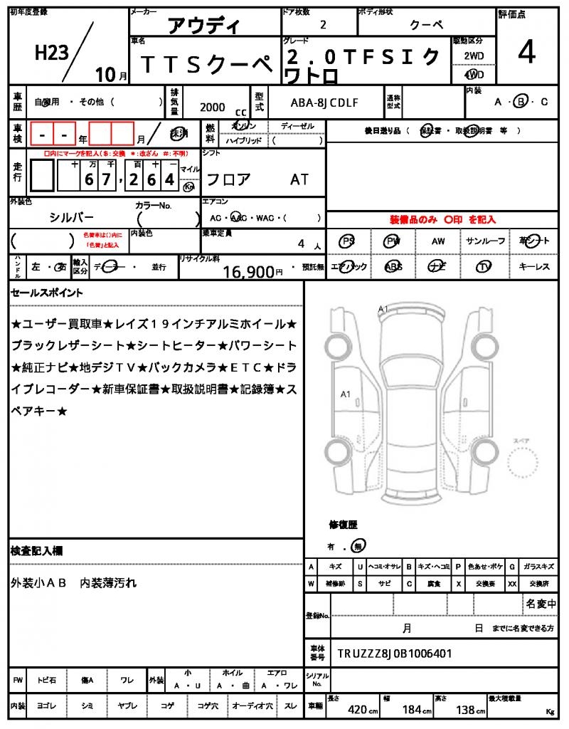 Meet the 2011 Audi TTS Coupe, a sleek and powerful silver bullet on the road. Under the hood, you’ll find a 2000 cc engine purring smoothly on gasoline, with 4WD providing traction and stability. As a used car from Japan, this Audi TTS Coupe is now available through AutoXGlobal for international buyers looking for a reliable ride. With features like power steering and power windows, this Japanese used car export is ready to hit the road and take you on a thrilling drive.